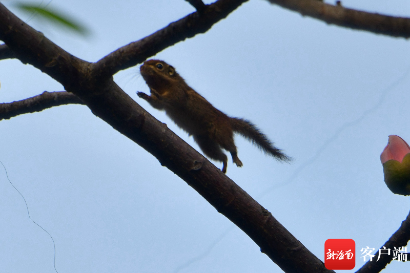 在木棉樹上奔跑的小松鼠。記者 陳衛東攝