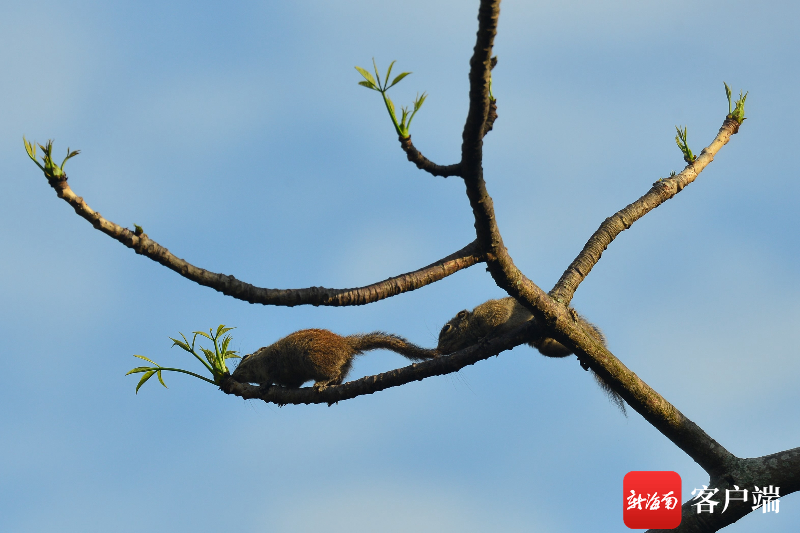 一棵木棉樹上,兩只小松鼠同框。記者 陳衛東攝