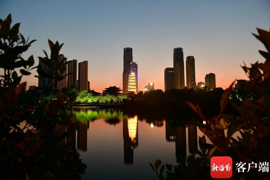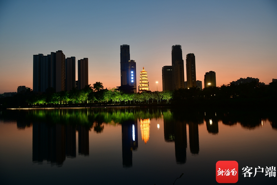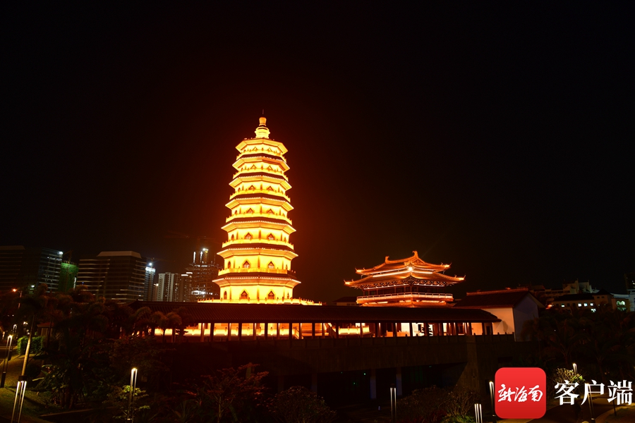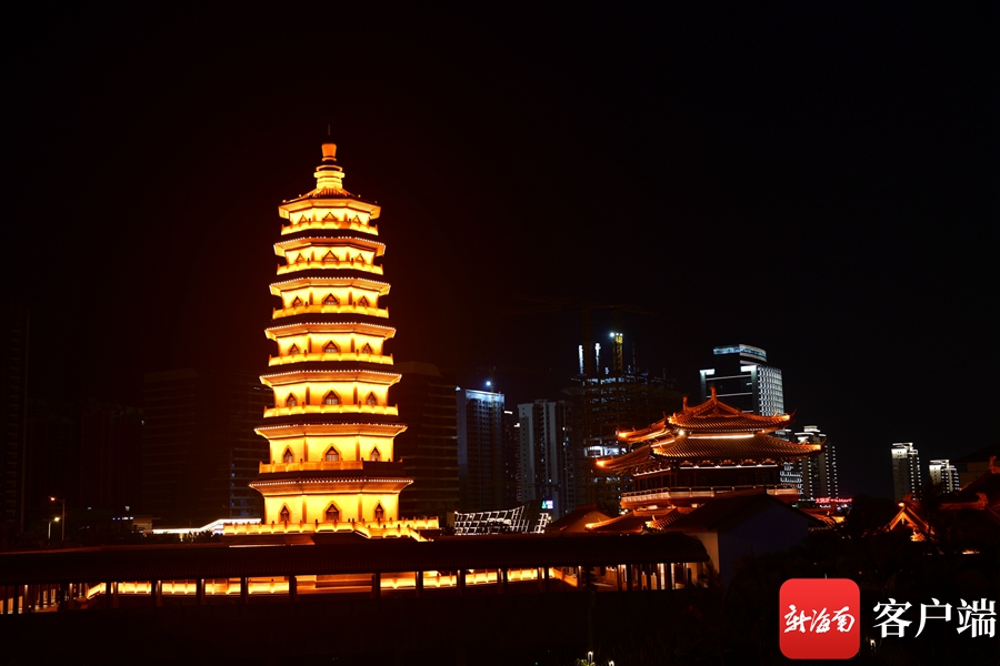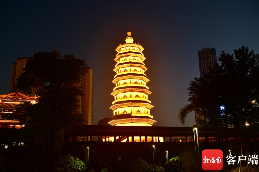 新海南客戶端、南海網、南國都市報4月10日消息 (記者 陳衛東)4月9日晚,記者拍到??诿鞑翢艉竺垒喢缞J的景觀,這座曾被譽為“瓊州第一塔”的明昌塔流光溢彩,為??谟衷鎏硪粋€網紅打卡地。