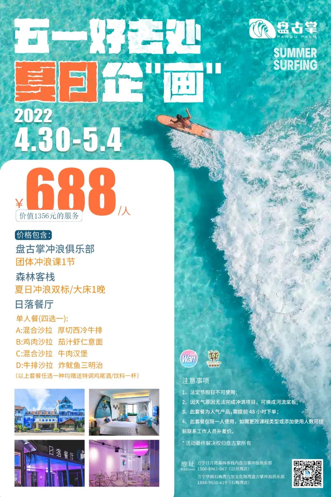 在日月灣,森林客棧聯手盤古掌沖浪俱樂部推出“五一好去處 夏日企‘畫’”活動,參與的游客既可以享受活力沖浪,又能在日落餐廳品嘗豐富的美食,享受愜意時光;萬寧龍之舟海洋民宿的“住民宿,帶您入鄉游”五一活動,包含后海踏浪、海釣、趕海抓蟹 、自助燒烤、卡拉OK、民宿等。