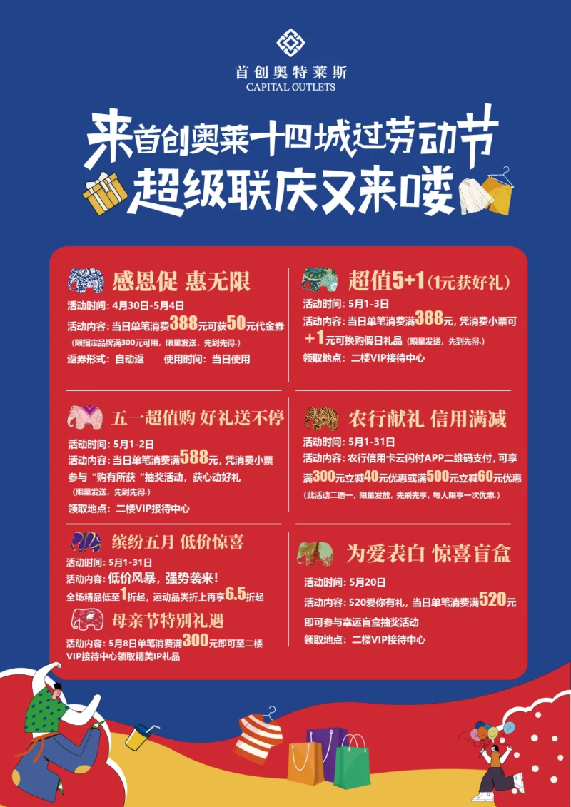 萬寧首創奧特萊斯精心策劃了“五一超值購 好禮送不停”“感恩促 惠無限”“超值5+1(1元獲好禮)”等一系列主題活動,各大品牌也趁勢推出眾多折扣福利,給市民游客們提供超值的優惠體驗。