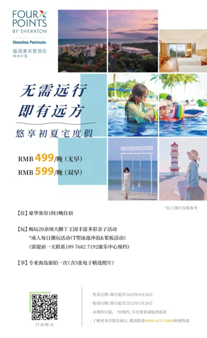 假日,石梅灣威斯汀度假酒店精心打造999元/晚“汀·海|復蘇之旅”,帶領住客一站式體驗假日生活;石梅灣艾美度假酒店精心推出668元起的“加井島浪漫海景晚宴”、398元/套“茶. 馥 海景下午茶”、888元/套“瓊味江南中式套餐”等風格不同、各具特色的餐飲優惠套餐;海南康樂園海航度假酒店推出418元購“椰泉別墅豪華房”1間1晚或2間1晚的超值優惠;神州半島福朋喜來登酒店結合現有的沖浪、精致露營地、日落酒吧等業態,推出“無需遠方 即有遠方”“泳池派對”“五一公益環保瑜伽”等潮流活動,綻放初夏無限精彩。