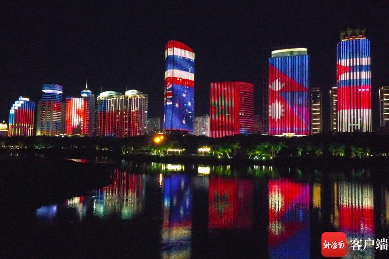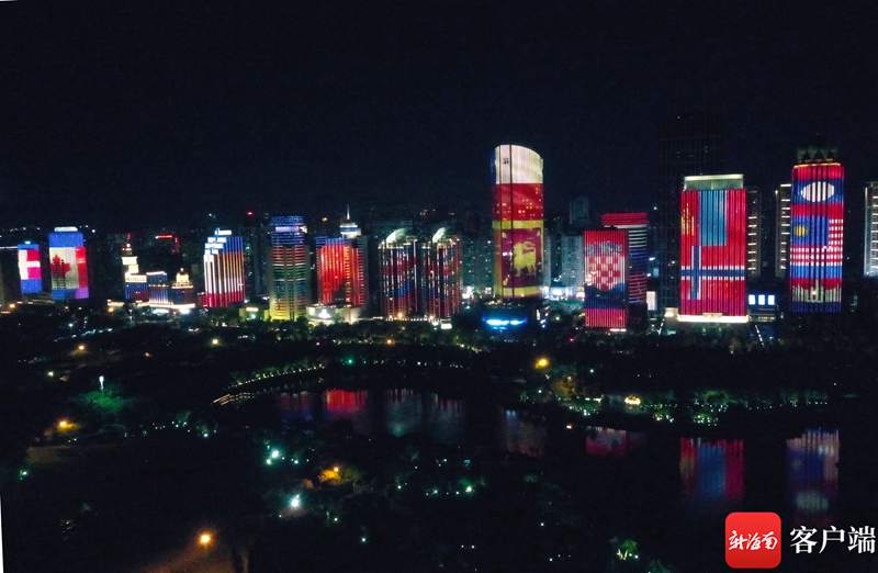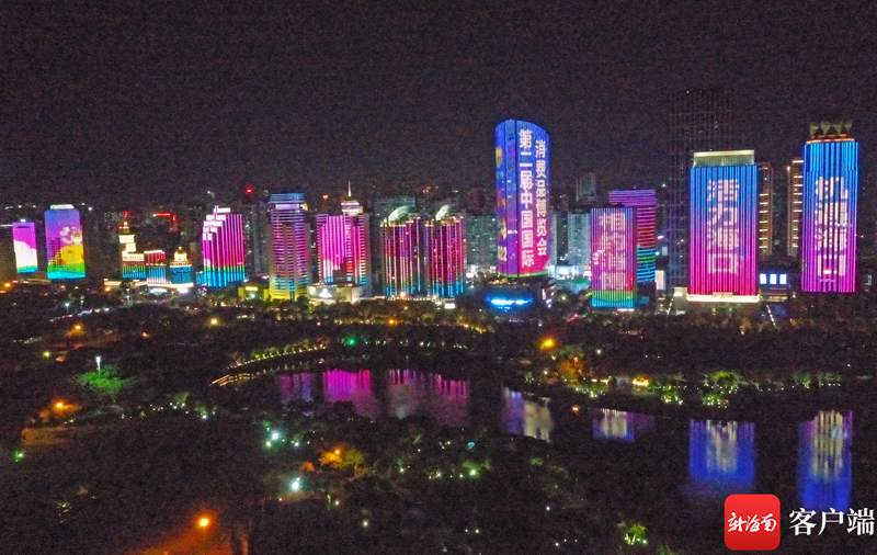 ??谑袨I海大道樓宇上演美輪美奐的消博會主題燈光秀,喜迎參加第二屆消博會的八方賓客。記者汪承賢攝