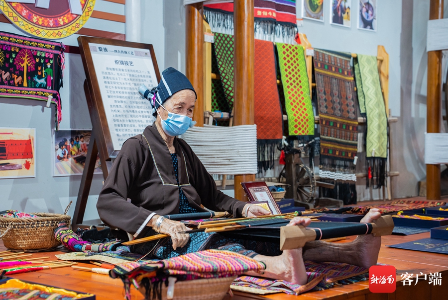 剛聽完阿靜介紹黎族繡面文身民俗,下一個場館,正在從容織錦的符金花老人就吸引了大家的目光。看到符金花老人的第一眼,很難不注意到她的小腿、手臂,有著青色的花紋。阿靜說,符金花是黎族最后一代繡面文身女性之一。老人大方迎接文化名家們好奇的目光,面對相機鏡頭伸出大拇指,微笑地說著“波隆”(黎族方言,你好)。